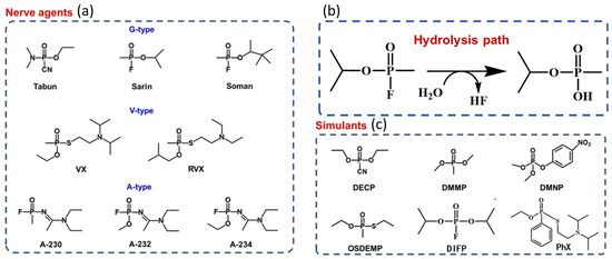 Common nerve agents (a), typical detoxification pathways (b), and their simulants (c). (VX: O-ethyl S-(2-diisopropylaminoethyl) methylphosphonothiolate; RVX: Russian VX; DECP: diethyl cyanophosphonate; DMMP: dimethyl methylphosphonate; DMNP: O,O-dimethyl-p-nitrophenyl phosphate; OSDEMP: O,S-diethyl methylphosphonothiolate; DIFP: diisopropyl fluorophosphate; PhX: O-ethyl S-(2-diisopropylaminoethyl) phenylphosphonothiolate).