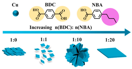 Schematic illustration of the coordination modulation method for preparing MOF nanosheets with different morphologies. Reprinted/adapted with permission from Ref. [68]. Copyright © 2022, Elsevier Inc. (Cu: copper; BDC: terephthalic acid; NBA: 4-butylbenzoic acid).