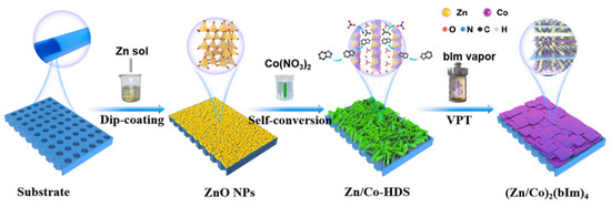 Schematic illustration of the vapor-phase transformation strategy for bimetallic nanosheet membranes. Reprinted/adapted with permission from Ref. [70]. Copyright © 2021, Elsevier B.V. (ZnO NPs: ZnO nanoparticles; Zn/Co-HDS: Zn/Co hydroxy double salts; bIm vapor: benzimidazole vapor; VPT: vapor-phase transformation).