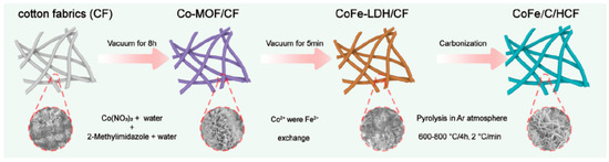 Synthetic process of in situ growth of cobalt MOF nanosheets on the surface of cotton fabric. Reprinted/adapted with permission from Ref. [74]. Copyright © 2022, American Chemical Society. (Co: cobalt; Fe: iron; CoFe-LDH/CF: CoFe–layered double-hydroxide/cotton fabrics; CoFe/C/HCF: CoFe/carbon/hollow carbon fibers).