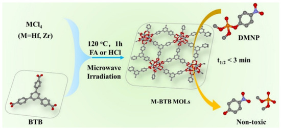 - Zhao, J.; Chen, R.; Huang, J.; Wang, F.; Tao, C.-A.; Wang, J. Facile Synthesis of Metal–Organic Layers with High Catalytic Performance toward Detoxification of a Chemical Warfare Agent Simulant. ACS Appl. Mater. Interfaces 2021, 13, 40863–40871. [Google Scholar] [CrossRef] [PubMed]