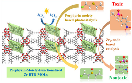 - Zhao, H.; Tao, C.-A.; Zhao, S.; Zou, X.; Wang, F.; Wang, J. Porphyrin-Moiety-Functionalized Metal-Organic Layers Exhibiting Catalytic Capabilities for Detoxifying Nerve Agent and Blister Agent Simulants. ACS Appl. Mater. Interfaces 2023, 15, 3297–3306. [Google Scholar] [CrossRef]