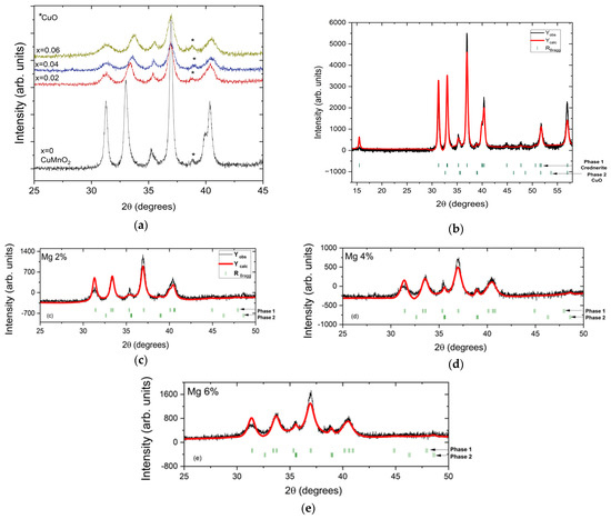 (a) Superposition of XRD patterns of CuMn1−xMgxO2 (x = 0, x = 0.02, x = 0.04, and x = 0.06); experimental X-ray powder diffraction pattern (black line) and calculated pattern (red line) of CuMn1−xMgxO2 ((b) for x = 0, (c) for x 0.02, (d) for x = 0.04, and (e) for x = 0.06). In (b–e), the upper row of vertical marks corresponds to Bragg reflections of phase 1 (crednerite phase), and the lower row corresponds to phase 2 (CuO phase), which are indicated by the horizontal arrows.