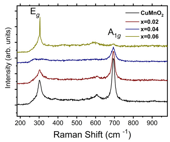 The Raman spectra of the CuMn1−xMgxO2 (x = 0, 0.02, 0.04, and 0.06) crednerite compounds, obtained at room temperature, are shown in Figure 2. As seen in Figure 2, the Raman modes were characterized by two intense peaks at ~695 cm−1 and 320 cm−1, with different intensities depending on the sample.