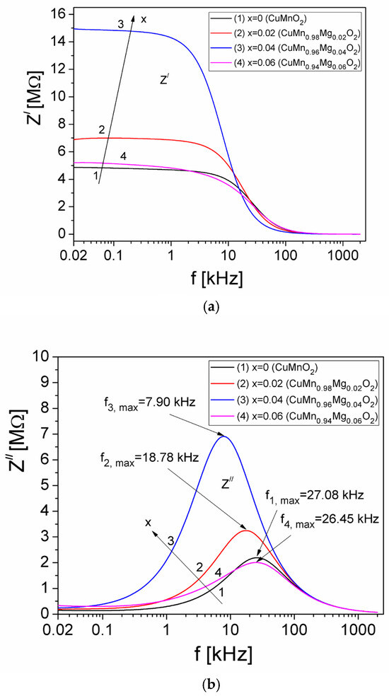 In Figure 3a, we can observe that, for each concentration, x, of Mg in CuMn1−xMgxO2, the real component, Z′, of the measurement cell remains approximately constant with the frequency, up to approximately 1 kHz; then, it decreases rapidly until approximately 100 kHz, after which Z′ decreases very slowly up to 2 MHz and the curves practically overlap. On the other hand, as can be seen in Figure 3b, the Z″ component of the measurement cell presents a maximum value for all concentrations, x, of Mg at a frequency denoted by fi,max (with i = 1 for x = 0, i = 2 for x = 0.02, i = 3 for x = 0.04, and i = 4 for x = 0.06). The appearance of this maximum value of the Z″ component shows the existence of an electrical relaxation process in the samples within the measurement cell [37], due to the presence of mobile charge carriers [27,28].