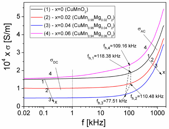 As can be seen in Figure 4, σDC depends on x, practically irrespective of frequency below 0.1 kHz; obtained values of σDC are listed in Table 2. In Table 2, we can observe that, by increasing the concentration (x) from 0 to 0.06, σDC varies from 15.36 × 10−5 S/m to 16.42 × 10−5 S/m, with a minimum value of 4.98 × 10−5 S/m presented at a concentration of x = 0.04. Our obtained values for σDC are similar to those obtained by other authors for CuFe1−xCrxO2 (0 < x < 1) delafossite samples [37] or for Cu1+xMn1−xO2 crednerite samples (with x = 0–0.10) [40,41], where the substitution determines the increase in electrical resistivity.