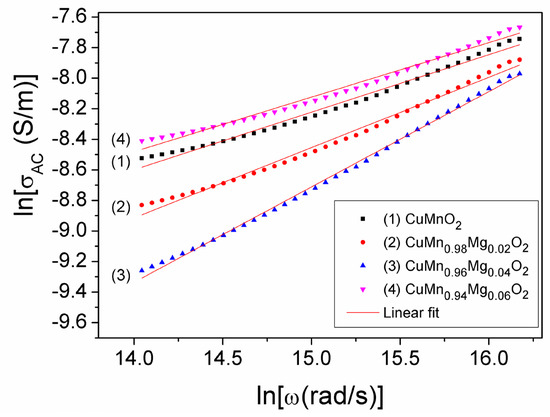 If we logarithmize Equation (3), we obtain a near-linear relationship between ln(σAC) and ln(ω), whose graphic representation is shown in Figure 5 at different concentration values (x) of substituted Mg in the CuMn1−xMgxO2 crednerite sample. By fitting the experimental dependencies ln(σAC)(ln(ω)), we were able to determine both the exponent n and the parameter A0 corresponding to each concentration (x) of Mg substituted in the samples. The obtained results are listed in Table 2.