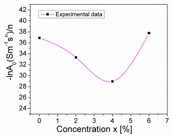 As can be observed from Table 2, increasing the concentration of the Mg substitution from x = 0 to x = 0.06, causes the exponent, n, to vary from 0.376 to 0.357, reaching a maximum value of 0.624 at x = 0.04. This variation in n can be correlated with the variation in concentration, x, of the ratio –lnA0/n (Figure 6), as shown in Refs. [44,45,46,47]. An appreciable change in this ratio (Figure 4) corresponds to a change in the static conductivity, σDC, due to the substitution of Mn3+ with Mg2+ (Figure 5). This modification in conductivity, σDC, may also be due to the presence of the CuO secondary phase, which was found in different quantities in the investigated samples and was highlighted using XRD analysis (see Table 1).