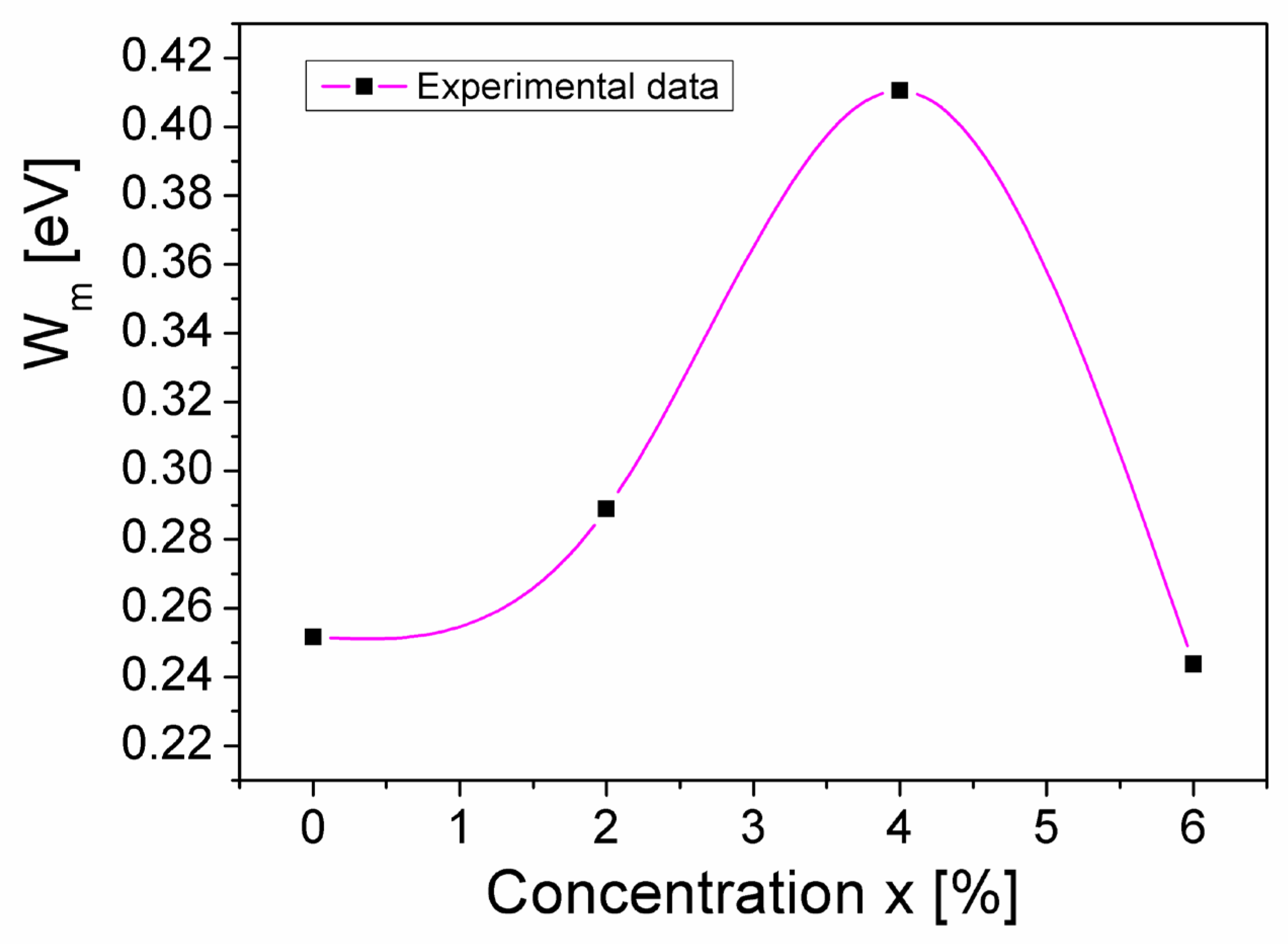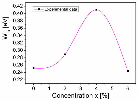 where kB is the Boltzmann constant, T is the absolute temperature, and Wm represents the maximum barrier height (equal to the band gap energy) [26,28]. Considering the values n of the samples (see Table 2) and knowing that the thermal energy, kBT, at room temperature (T = 300 K) is KBT = 0.026 eV, Wm can be determined using Equation (5). In Figure 7, the concentration dependence of the energy barrier, Wm, of the CuMn1−xMgxO2 samples is presented.