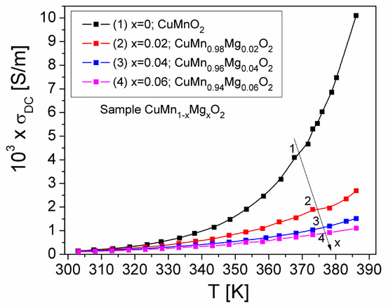 Figure 8 shows the temperature dependence of the σDC(T) conductivity of the CuMn1−xMgxO2 crednerite samples. The static conductivity, σDC(T), increases with temperature (Figure 8) for all concentrations (x) of substituted Mg, indicating that the conduction process is thermally activated in the temperature range of 300–390 K within a static field. At the same time, the increase in σDC conductivity with temperature, for each concentration (x) of Mg, demonstrates a semiconductor-type behavior; this is due to the increase in the drift mobility of charge carriers in the sample, according to Mott’s VRH model [27]. Also, in Figure 8, we can observe that, by increasing the concentration of substituted Mg in the crednerite CuMn1−xMgxO2 sample, the conductivity, σDC, decreases. Similar behavior of the static conductivity, σDC(T), with the temperature was also obtained for other materials such as Cu1+xMn1−xO2 (x = 0 and 0.06) crednerite materials [26] or vivianite polycrystalline materials [48].