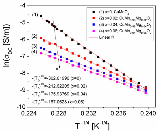 The ln(σDC)(T−1/4) plots of CuMn1−xMgxO2 crednerite samples for different concentration values (x) of substituted Mg, which agree with the VRH model.