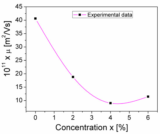 where VT = kBT/e, is the thermal voltage, which, at room temperature (T = 300 K), has a value of 26 mV. Using Equation (13), the Mg concentration dependence of the charge carrier’s mobility, μ, was determined; this μ(x) dependence is shown in Figure 10. The μ values are of the same order of magnitude as values obtained by other authors for similar samples of crednerite [37].