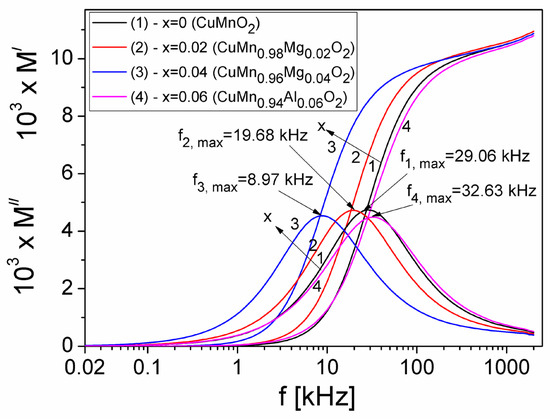 Frequency dependence of the real (M′) and imaginary (M″) components of the electric modulus of samples, in the frequency range (20 Hz–2 MHz) and at different concentrations x of substituted Mg in the crednerite CuMnO2 material, is shown in Figure 11.