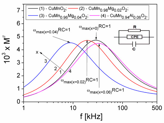 To estimate the R, C and Q values and their dependence on the concentration x of the Mg substituted in the crednerite sample, CuMn1−xMgxO2, in Figure 12, both the dependence M″ (f) for different values x of the concentration of Mg substituted and the equivalent parallel circuit RQC, were represented.