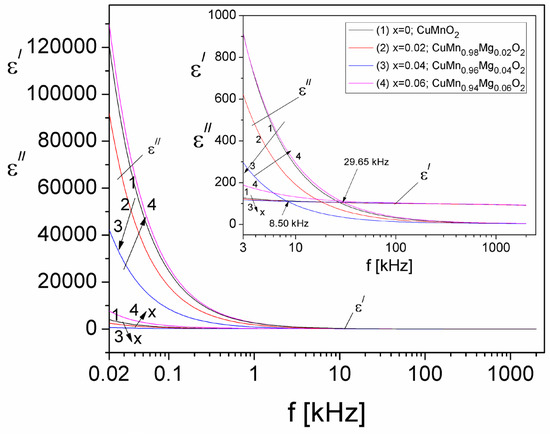 The frequency dependence of ε′ and ε″ components for different values of concentration of substituted Mg ions in the CuMn1−xMgxO2 crednerite sample is presented in Figure 13.
