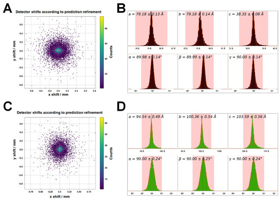Serial crystallography data processing for lysozyme and glucose isomerase (GI) datasets. (A) Detector shifts based on prediction refinement and (B) unit cell distribution for the lysozyme dataset. (C) Detector shifts based on prediction refinement and (D) unit cell distribution for the GI dataset. The red lines in (B,D) represent Gaussian function fits to the unit cell constant distribution.