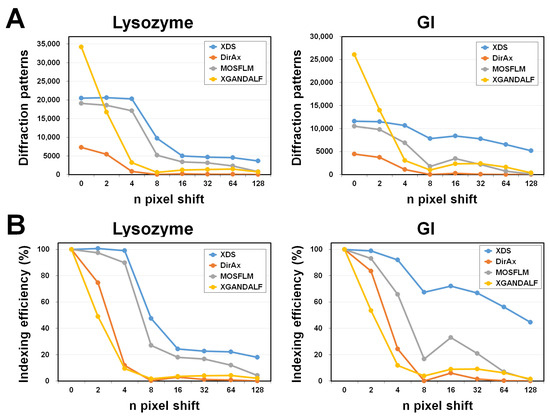 The indexing efficiency of the diffraction peaks varies based on the indexing algorithm [49,50], suggesting that the accuracy of the beam center could influence the indexing efficiency differently across algorithms. To assess the effect of the beam center shifts on indexing efficiency, the diffraction data were indexed using the XDS, MOSFLM, DirAx, and XGANDALF indexing algorithms with beam center shifts of 2, 4, 8, 16, 32, 64, and 128 pixels in both the +X and +Y axes (Supplementary Figure S1). As a result, despite using the same dataset and indexing parameters, the indexing efficiency varied across the algorithms (Figure 2).