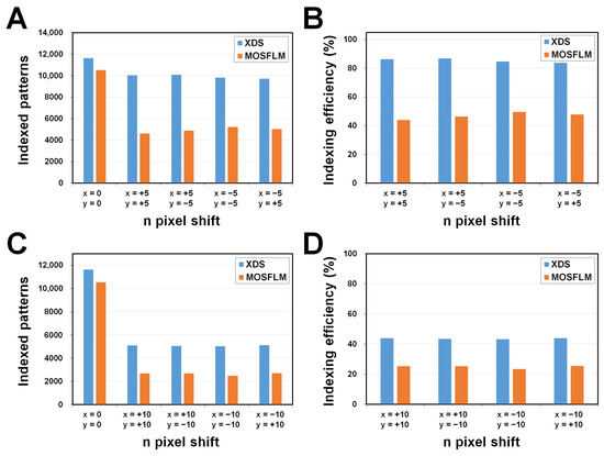 For lysozyme, XDS indexing yielded the following numbers of diffraction patterns for a five-pixel shift: 20,013 (quadrant I: +x, +y; 97.66% indexing efficiency), 20,097 (quadrant II: +x, −y; 98.07%), 19,691 (quadrant III: −x, −y; 96.06%), and 19,686 (quadrant IV: −x, +y; 96.09%). For a 10-pixel shift, the indexed diffraction patterns were as follows: 4417 (quadrant I; 21.55%), 4478 (quadrant II; 21.85%), 4301 (quadrant III; 20.99%), and 4217 (quadrant IV; 20.58%) (Figure 3A,B). Using MOSFLM for lysozyme, the diffraction patterns indexed for a five-pixel shift were as follows: 14,752 (quadrant I; 77.40%), 14,651 (quadrant II; 76.87%), 14,879 (quadrant III; 78.06%), and 14,701 (quadrant IV; 77.13%). For a 10-pixel shift, the numbers of indexed diffraction patterns were 3933 (quadrant I; 20.63%), 4029 (quadrant II; 21.14%), 4101 (quadrant III; 21.92%), and 4178 (quadrant IV; 21.52%) (Figure 3A,B).
