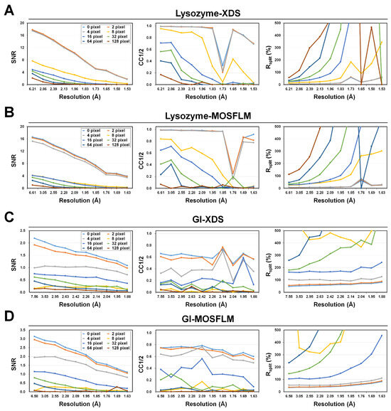 For the lysozyme dataset processed using XDS, beam center shifts of two and four pixels yielded signal-to-noise ratio (SNR), CC1/2, CC*, and Rsplit values similar to those obtained using the optimized beam center (Figure 4A and Supplementary Figure S2). However, shifts of eight pixels or more resulted in decreased data quality across resolutions, evidenced by the reduced SNR, CC1/2, and CC* values. Similarly, the lysozyme dataset processed using MOSFLM showed absolute SNR, CC1/2, and CC* values differing from those obtained using XDS; however, the overall trends were consistent. Specifically, beam center shifts of two and four pixels yielded data quality metrics similar to those observed with the optimized beam center (Figure 4B and Supplementary Figure S2). Notably, for datasets processed with MOSFLM, the CC1/2 and CC* profiles exhibited a significant drop in values around 1.73 Å resolution. This likely resulted from background noise caused by scattering originating from the sample delivery material during data collection, contributing to reduced values in this region.