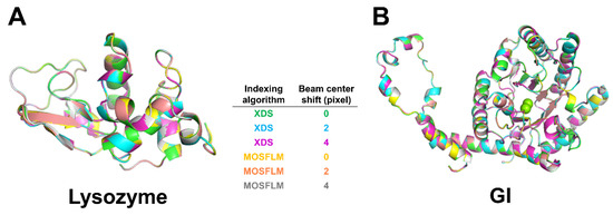 Superposition of the (A) lysozyme and (B) GI structures processed using XDS and MOSFLM with beam center shifts of 0, 2, and 4 pixels. Two spheres in the GI structures represent the metal ions.