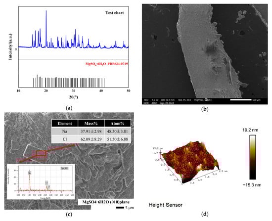 This suggests that Na+ and Cl− ions in the system, having reached saturation, occupy active growth sites on MgSO4·6H2O surfaces [27]. Figure 9a illustrates how Na+ and Cl− diffuse and are adsorbed onto MgSO4·6H2O clusters via electrostatic interactions, leading to the formation of local NaCl nuclei [28,29]. These nuclei modify the relative growth rates of different crystallization sites, altering the crystal morphology [30].
