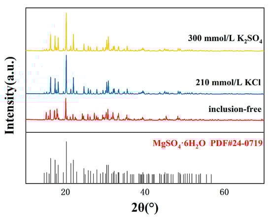 To explore the influence of impurity ions in the solution on cryogenic crystallization products, commonly found impurity ions in brine were added to the MgSO4-NaCl saturated solution. The chemical composition, phase composition, and morphology of the resulting crystalline products were analyzed, with the results shown in Figure 4, Figure 5, Figure 6 and Figure 7. As shown in Figure 4, the addition of trace impurity ions significantly reduced the sodium content in the crystallized product. For example, when 300 mmol/L K2SO4 was added, the sodium mass fraction in the product decreased from 0.57% to 0.03%, resulting in the highest-purity product.