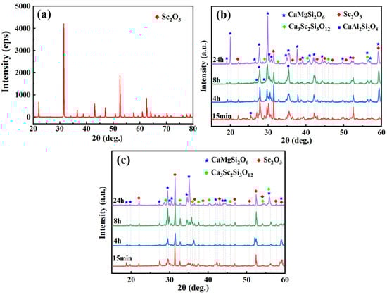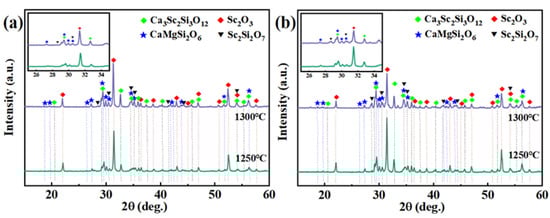 The phase constituents of each set of the mixed powders of Sc2O3–CMAS (1:1 wt.%) under high temperatures for different times are shown in Figure 1. According to Figure 1a, the diopside (CaMgSi2O6, PDF#086-0932) and garnet (Ca3Sc2Si3O12, PDF#04-008-4631) phases and minor Sc2Si2O7 (PDF#031-1225) phase are observed in the Sc2O3–CMAS mixed powder after reaction for 15 min, and Sc2O3 (PDF#023-1402) is still detected after reaction with CMAS at elevated temperature. The phases of the mixture after exposure for 4 h is similar to that after reaction for 15 min (Figure 1b), showing that the reaction of the Sc2O3–CMAS mixed powder is not drastic [43]. Note that the amount of the diopside phase is more than that of the garnet according to the higher diffraction peaks of diopside around 25–35°. It is indicated that the reaction of the mixed powder mainly causes CMAS crystallization when below 1300 °C. Furthermore, Sc-apatite could not be detected in Figure 1, resulting from the low reactivity of Sc2O3 in the CMAS and the poor affinity between the Ca2+ and Sc3+ [41,44]. The whole reactions are summarized as:
