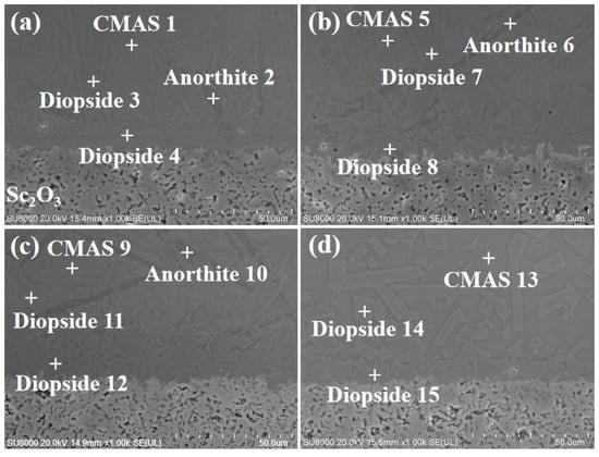 The SEM graphs of the Sc2O3 ceramics after reaction with the melt at 1250 °C are presented in Figure 3 (the symbol “+” is used to highlight the zones, and the number is the name for the zones). It is clear that a distinct continuous DRL forms at the boundary of the Sc2O3 ceramic and CMAS. The DRL is mainly composed of the diopside phase (corresponding to regions #4, 8, 12 and 15 in Figure 3 and Table 1). The rod-like or block-like crystallization phases in CMAS mainly are diopside and a small amount of anorthite, which vertically grow into the CMAS. The diopside phase shows coarsening during the initial reaction stage, while it shows a short/small lumpy phase after long exposure. The diopside phase undergoes dissolution during reaction [46]. It is worth noting that no anorthite phase can be detected after reaction for 24 h, while it can be observed within 8 h (Figure 3a–c), indicating that the diopside and anorthite show poor thermostability in the molten CMAS.