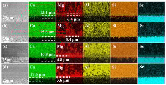 Elemental mappings of Sc2O3 ceramics after reaction with the melt at 1250 °C for (a) 15 min, (b) 4 h, (c) 8 h and (d) 24 h.