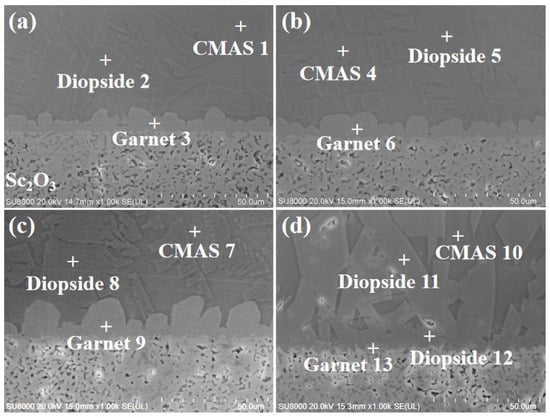 The reaction of the Sc2O3 ceramic with CMAS results in the crystallization of residual CMAS, resulting from the change in chemical composition [44]. According to Table 1, it can be seen that Ca2+ is one of the key ions from the CMAS. The concentration of Ca2+ in CMAS in region #1 (Figure 3a) is about 33.4 at% after reaction at 1250 °C for 15 min (Table 1), while it is 32.2, 32.0 and 25.7 (at%) for residual CMAS after reaction for 4 h, 8 h and 24 h (regions #5, 9 and 13 in Table 1), respectively. It decreases with reaction time, attributing to the formation of diopside and garnet phases. Furthermore, the content of Sc3+ in the remaining melt increases with time, resulting from the dissolution of the Sc2O3 ceramic when exposed to the molten CMAS, and the average content of Sc3+ is about 0.7 at% (except for that after 15 min). The contents of Si4+, Mg2+ and Al3+ also vary with exposure time. The change in composition leads to the crystallization of CMAS, which increases the melt viscosity and mitigates the infiltration [23].