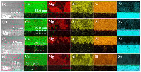 The elemental mappings of the Sc2O3 ceramics after reaction with the melt at 1300 °C are presented in Figure 6. The DRL shows a good effect on alleviating the Mg2+ infiltration and some mitigating effect on Al3+. An infiltration zone with some Ca forms beneath the DRL according to the Ca mapping. The penetration depth increases with reaction time, whose depths are 13.6 μm, 15.0 μm, 28.9 μm and 68.5 μm after reaction for 15 min, 4 h, 8 h and 24 h, respectively. The infiltration of Si is similar to that of Ca. More melt crystallization for more diopside phases is detected in the CMAS from the elemental mapping of Mg. It is a result of the composition change of the melt such as the decrease in Ca as well as the increase in Sc [21] (zones #1, 4, 7 and 10 in Table 2).