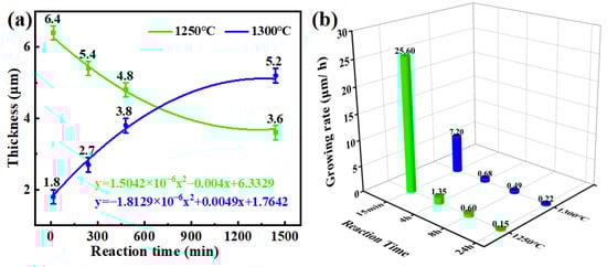 A DRL forms at the Sc2O3/CMAS interface after exposure to the molten CMAS for 15 min, and the changes of thickness of the DRL with reaction temperature and time are shown in Figure 7a. The growing of the thickness follows the parabolic law, and the corresponding equations are well fitted with y = Ax2 + Bx + C. It is obvious that the DRL decreases with time at 1250 °C, resulting from the dissolution of the diopside phase, while the DRL thickens with time at 1300 °C. This is a result of the lower viscosity of CMAS [23] and the increasing concentration of the Sc3+ in the residual CMAS (Table 2) [48]. The growing DRL becomes steady after reaction for 24 h, indicating that there is a dynamic balancing state of thickening and dissolution for the DRL during exposure to the melt.