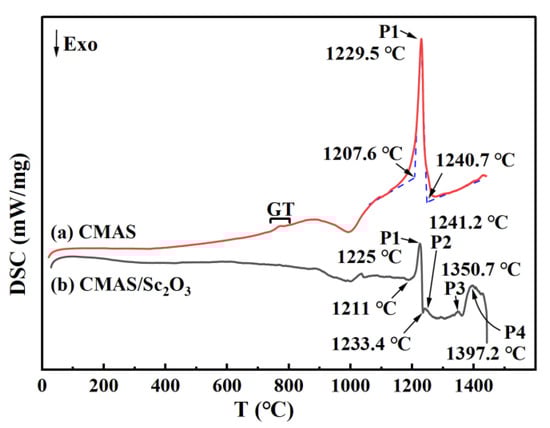 DSC curves of (a) CMAS and (b) mixture of CMAS–Sc2O3 (1:1 wt.%).