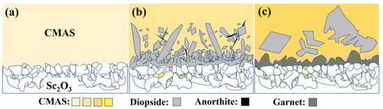 Schematics of the thermochemical interactions of the CMAS and Sc2O3 ceramic at high temperature (a) before interaction, (b) 1250 °C and (c) 1300 °C.