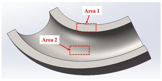 To compare the accuracy of two finite element models, experimental verification was carried out on the stress concentration regions associated with their outcomes (i.e., where the maximum stress appears during the finite element analysis under steady-state operation conditions). Figure 2 shows the schematic diagram of the selected areas of the elbow for microstructure characterization and mechanical property tests. As indicated by subsequent finite element analysis results, the highest stress concentration is observed at the inner wall of the elbow. Therefore, the specific site is situated near the inner wall, with position 1 referring to the inner arc center (named Area 1) and position 2 referring to the neutral plane of the elbow (Area 2). Microstructural observations, hardness, tensile, and creep properties were examined for both regions.