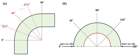 The Brinell hardness measurement was conducted on the inner wall of the 12Cr1MoV elbow using an HT-1000A hardness tester (G&R Technology Inc., Santa Clara, CA, USA). A schematic diagram illustrating the measurement area is presented in Figure 3. Figure 3a shows the selected cross-sections for hardness tests. Since the 0° and 90° cross-sections are weld areas, their hardness measurements are not representative. Therefore, three cross-sections (22.5°, 45°, and 67.5°) on the elbow were selected for measurement. Moreover, we mainly focus on the inner wall of the elbow, and Figure 3b exhibits the detailed locations for hardness tests on each cross-section. The measurements started from the outer arc side (marked by 0°) and proceeded successively at intervals of 45° until reaching the inner arc region (marked by 180°). For each location, five points were tested, and the average value represents its corresponding hardness value.