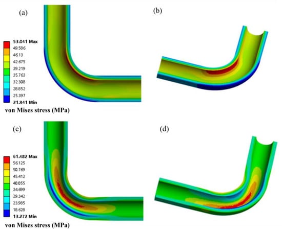 The stress distribution of the modified elbow model designed based on the actual dimensions is depicted in Figure 5c,d. In contrast to Figure 5a, it can be observed that the stress concentration zone has shifted to the upper and lower ends of the circumferential elliptical cross-section of the inner wall of the elbow (at 90° and 270° locations of the circumferential section as shown in Figure 3b), with the maximum stress being 61.482 MPa. The area of the maximum stress gradually reduces from a 45° cross-section of the elbow toward 0° and 90 ° cross-sections until it reaches the minimum at the part connected to the straight pipe. The minimum stress area is distributed in the inner wall region of the outer arc of the elbow, with a minimum stress value of 13.272 MPa.
