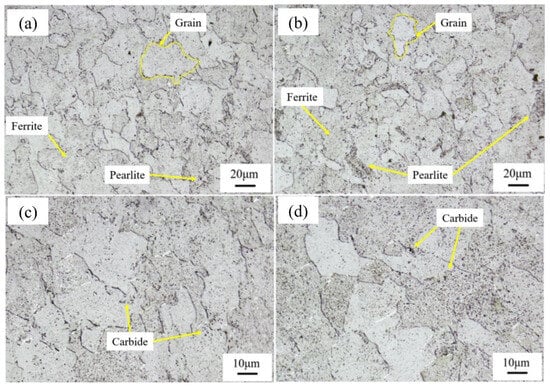 The optical microstructure images of the two areas at low and high magnifications: (a,b) Area 1; (c,d) Area 2.