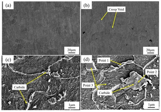 In order to further observe the microstructural discrepancies in different regions, Figure 7 presents the SEM images of the two regions. As can be seen from Figure 7a,b, there are nearly no obvious pores in Area 1, and the overall compactness remains relatively good. While in Area 2, distinct pores can be observed, and these pores are typically located at the grain boundaries. It is likely that the aggregation of carbides at the grain boundaries leads to the creep of the material during long-term service, which is a typical deterioration characteristic of metallic materials in long-term service [22].