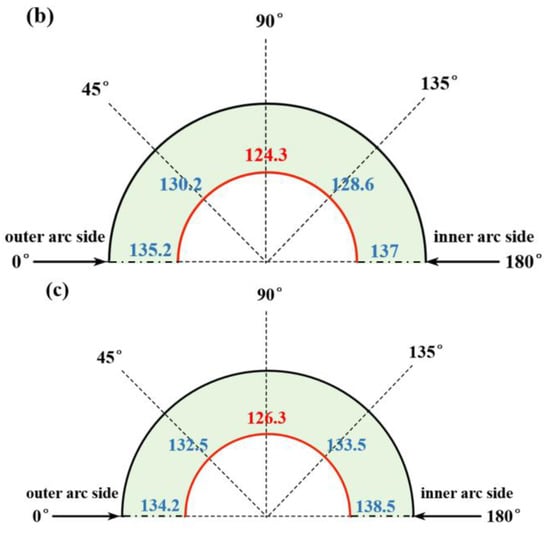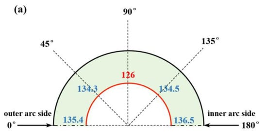 Figure 8a–c present the hardness distribution of the circumferential sections of the elbow at 22.5°, 45°, and 67.5° cross-sections. It can be observed that the regions with the minimum hardness in all three circumferential sections are at the 90° position (270°), and the hardness at the 90° position in the axial 45° circumferential section is the lowest. From the hardness data of the two circumferential sections at axial 22.5° and 67.5°, it can be noted that the hardness distribution in the symmetrical circumferential section areas in the axial direction is essentially consistent.