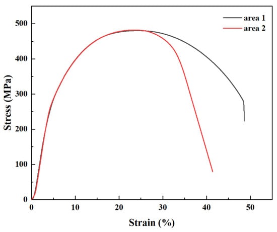 Figure 9 presents the room-temperature tensile engineering stress–strain curves of 12Cr1MoV alloys in Area 1 and Area 2. It is apparent that the two curves are almost overlapping from the original point to the point representing the ultimate tensile strength, suggesting that the ultimate tensile strength of the two regions are comparable, being 482 MPa and 480 MPa, respectively. In relevant studies [27], the measured ultimate tensile strength of the 12Cr1MoV material at room temperature ranges from 470 MPa to 640 MPa. As a consequence, it can be seen that the ultimate tensile strength of the samples from the two regions is relatively low after long-term service. Nevertheless, there is an obvious difference in the plasticity of the two alloys. After reaching the ultimate strength, the engineering stress–strain curves of the two regions exhibit significant differentiation. The curve of Area 1 descends more slowly, presenting a longer plastic (necking) stage, indicating that the material in this region possesses better plasticity, with the fracture strain approaching 50%. The curve of Area 2 decreases more steeply, suggesting that this region enters the fracture stage more rapidly after reaching the ultimate strength, and the plasticity is relatively poor (42%). Additionally, by comparing the area under the engineering stress–strain curves, the toughness of the material can be estimated. The area encompassed by the curve of Area 1 is significantly larger than that of Area 2, indicating that the toughness of Area 2 has decreased, possibly due to the occurrence of microstructure embrittlement during service. In connection with the microstructural characteristics of the alloy in Section 4.2, it can be found that the aggregation of the second phase at the grain boundaries and the coarsening of some carbide particles all lead to an increase in the brittleness and a decrease in the toughness of the material.