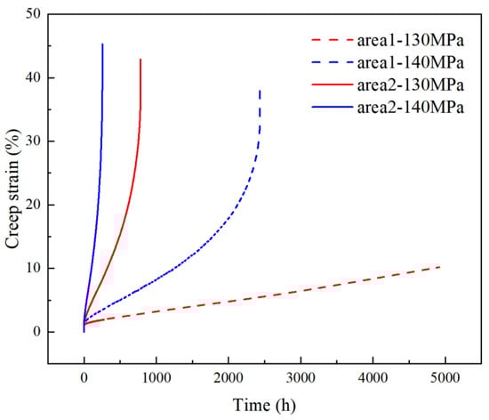 Table 4 illustrates the creep test results of the specimens from Area 1 and Area 2 at the temperature of 540 °C and stresses of 130 MPa and 140 MPa, respectively. The corresponding creep curves are depicted in Figure 10. Under the higher stress level of 140 MPa, both samples were fractured, with the fracture times being 2434 h and 253 h, respectively, for Areas 1 and 2. The creep fracture time of Area 1 is notably longer than that of Area 2. Similarly, when the stress level was lower to 130 MPa, the sample from Area 2 fractured after 785 h of creep test, while the sample from Area 1 did not fracture after nearly 5000 h of creep test. Generally, the typical creep curves of metallic materials comprise three stages, i.e., the decelerated creep stage (stage I), the steady-state creep stage (stage II), and the accelerated creep stage (stage III). Nevertheless, the steady-state creep stage was not observed in the sample from Area 2 under either of the two creep test conditions, meaning that the creep rapidly entered the third stage and then fractured. The sample from Area 1 presented the steady-state creep stage under both test conditions, with the steady-state creep rates being 2.14 × 10−8 s−1 and 4.72 × 10−9 s−1, respectively, suggesting that the alloy in this area has much better creep resistance than Area 2. Particularly for the condition of 130 MPa, the sample from Area 1 has not entered the accelerated creep stage within the test time range. Hence, by comparing the creep test results of Area 1 and Area 2, it can be determined that the creep resistance of Area 2 has decreased significantly, which should be closely associated with the evolution of its microstructure.