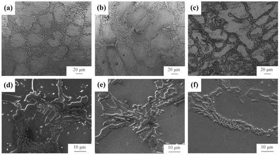 Microstructure of HCCIs with different nickel content: (a–c) OM microstructure; (d–f) SEM microstructure; (a,d) 0.65 wt.%, (b,e) 1.50 wt.%, (c,f) 3.05 wt.% [].