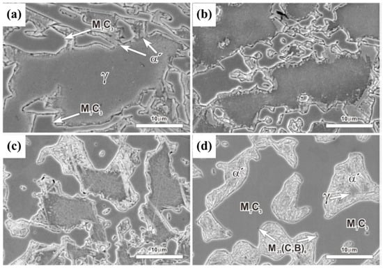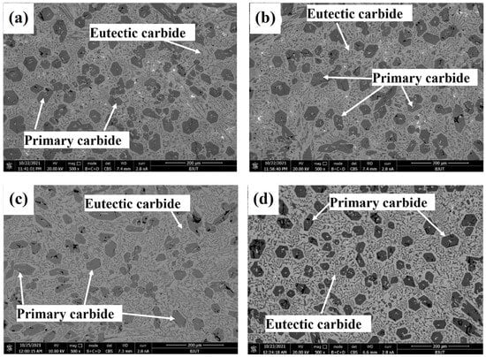 SEM micrographs of the as-cast microstructure of HCCIs with different boron contents: (a) 0 wt.%; (b) 0.297 wt.%; (c) 0.598 wt.%; and (d) 1.197 wt.% [].