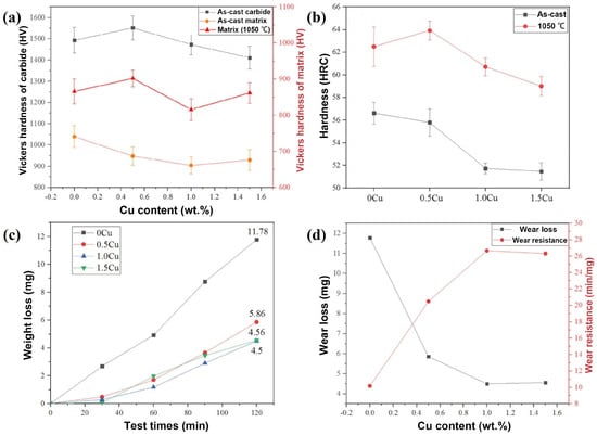 Effect of Cu content on the (a) microhardness and (b) Rockwell hardness of HHCCI (the “1050 °C” label represents the HHCCI sample which was heat-treated at 1050 °C for 1 h and then underwent air-cooling); effect of Cu content on the wear of HHCCI heat-treated at 1050 °C; (c) relationship between test time and wear amount; (d) effect of Cu content on wear resistance [].
