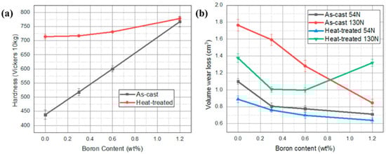 (a) Hardness as a function of the boron content in the Fe-17Cr-3C-1Ni-1Mo irons in the as-cast and heat-treated conditions; (b) wear volume loss as a function of the boron content in both as-cast and heat-treated conditions, tested with 54 and 130 N of applied load (the heat treatment process was heat preservation at 950 °C for 45 min and then air-cooled to room temperature) [].