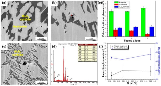 The backscattered electron micrographs and EDS of as-cast HCCIs with different nitrogen contents: (a) 0.028 wt.%, (b) 0.075 wt.%, (c) 0.2 wt.%, (d) the EDS of point A; (e) volume fraction of austenite, martensite, and M7C3 carbide in tested alloys (numbers 1, 2, and 3 correspond to the as-cast HCCIs with different nitrogen contents of 0.028 wt.%, 0.075 wt.%, and 0.2 wt.%, respectively); (f) the Rockwell hardness and impact toughness curve of HCCIs with different N contents [].