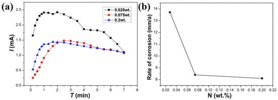(a) Passivation curves of HCCI with different nitrogen contents, where I is the passivation current, and T represents time; (b) relationship between corrosion rate and nitrogen content of HCCI [].