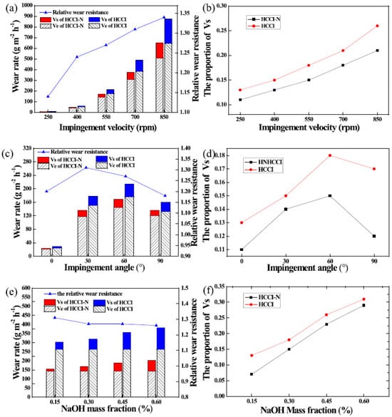 The effect of impingement velocity, impingement angles, and concentrations of NaOH on the erosion wear rate and the relative wear resistance and the proportion of synergism Vs (interaction rate of corrosion and wear) in the erosion wear rate in alkali–sand slurry of an HCCI containing N element: (a) erosion wear velocity, (b) the proportion of Vs at different erosion and wear rates, (c) erosion wear angles, (d) the proportion of Vs at different erosion and wear angles, (e) NaOH concentration, (f) the proportion of Vs at different NaOH concentrations [].