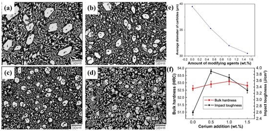 - Zhi, X.; Liu, J.; Xing, J.; Ma, S. Effect of cerium modification on microstructure and properties of hypereutectic high chromium cast iron. Mater. Sci. Eng. A 2014, 603, 98–103. [Google Scholar] [CrossRef]
